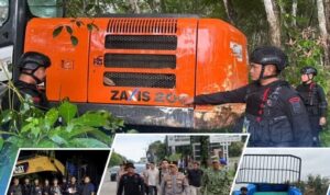 SATBRIMOB DAN DIT INTELKAM POLDA LAMPUNG Way Kanan Metro Indonesia News. TINDAK TEGAS TAMBANG EMAS ILEGAL DIWAY KANAN LAMPUNG. Tim Gabungan yang terdiri dari Dit Intelkam Polda Lampung dan Sat Brimob Polda Lampung melaksanakan operasi penindakan terhadap aktivitas Pertambangan Emas Tanpa Izin (PETI) di wilayah Kabupaten Way Kanan. Operasi skala besar ini menyasar tiga titik lokasi yang menjadi pusat kegiatan tambang ilegal pada Minggu, 8 Maret 2026.Kegiatan penindakan tersebut dilaksanakan di bawah pimpinan langsung Dansat Brimob Polda Lampung. Langkah tegas ini diambil sebagai respon cepat institusi kepolisian dalam memberantas praktik pertambangan liar yang tidak memiliki izin resmi dan merusak ekosistem lingkungan.Dari hasil operasi di lapangan, tim gabungan berhasil mengamankan barang bukti berupa 41 unit alat berat jenis ekskavator. Saat ini, 6 unit ekskavator telah diberangkatkan menuju Mapolda Lampung untuk keperluan penyidikan, sementara 35 unit lainnya masih berada di lokasi tambang dengan penjagaan ketat. Selain alat berat, petugas juga mengamankan 24 orang terduga pelaku yang ditemukan di lokasi saat aktivitas penambangan berlangsung.( S EFENDI.)